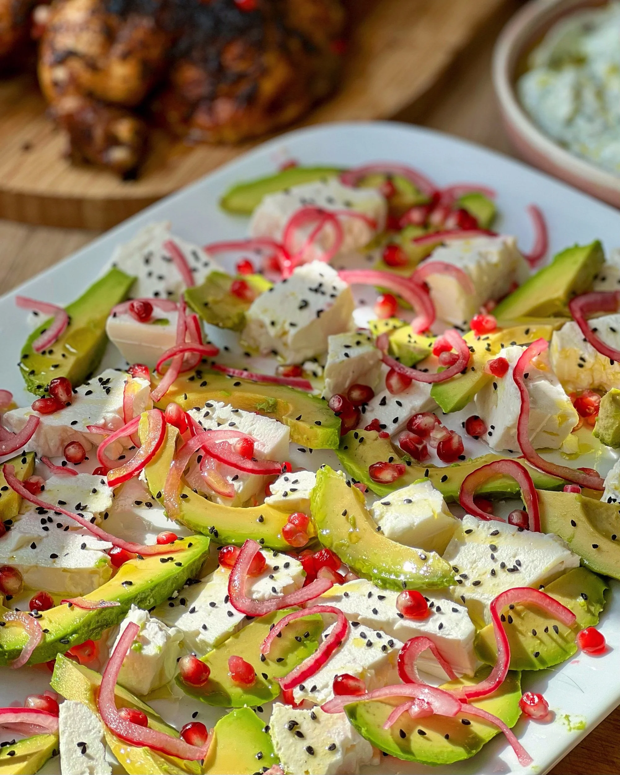 A gorgeous display of colour and beauty gleaming deliciously in the evening the sun: Day 254 is Nigella’s Feta and Avocado Salad with Red Onions, Pomegranate and Nigella Seeds.
