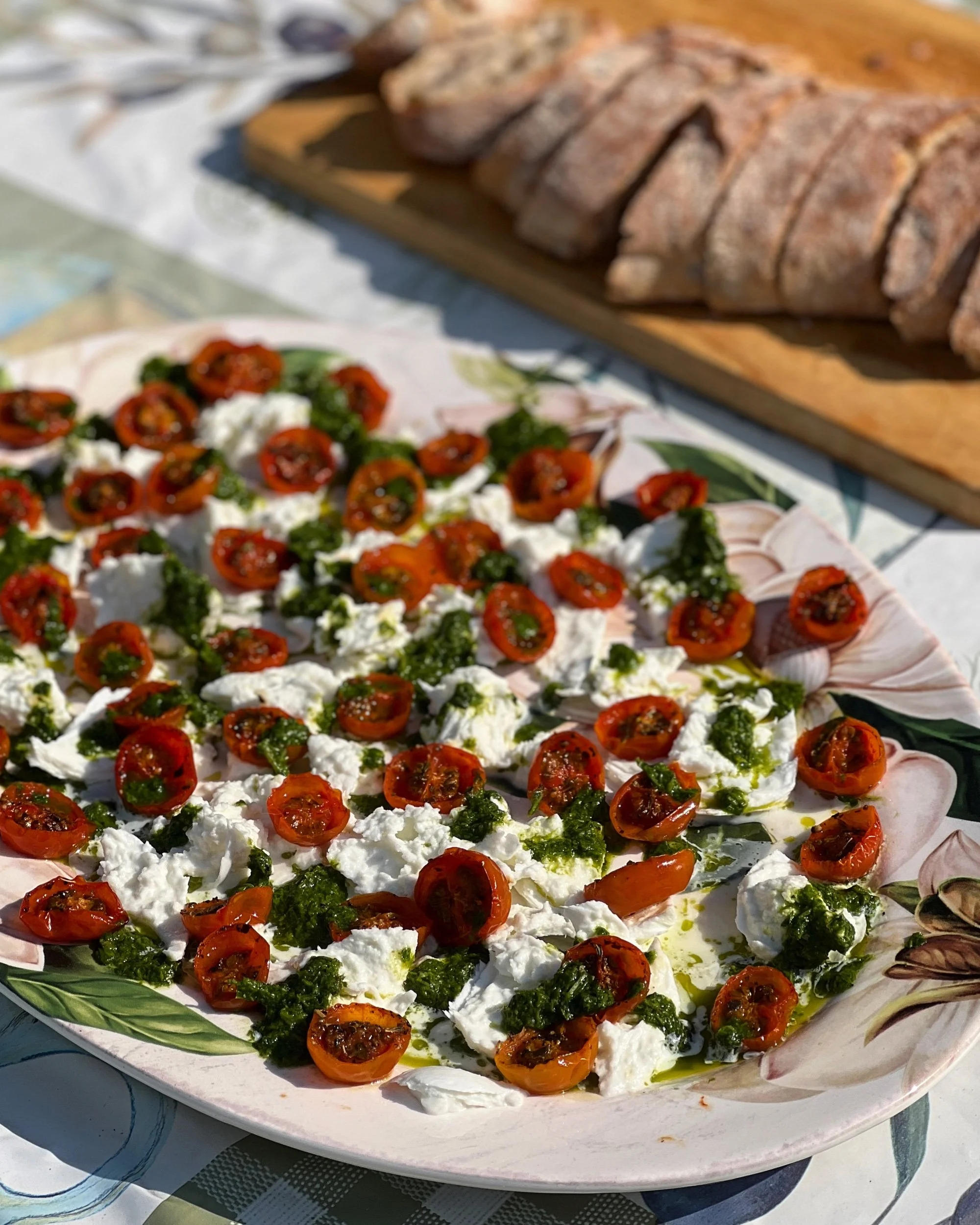 A tricoloured beauty of milky-white buffalo, intensified cherry-red toms and a blitzed grass-green sauce: Day 277 is Tomatoes, Mozzarella and Basil, Nigella’s Way.