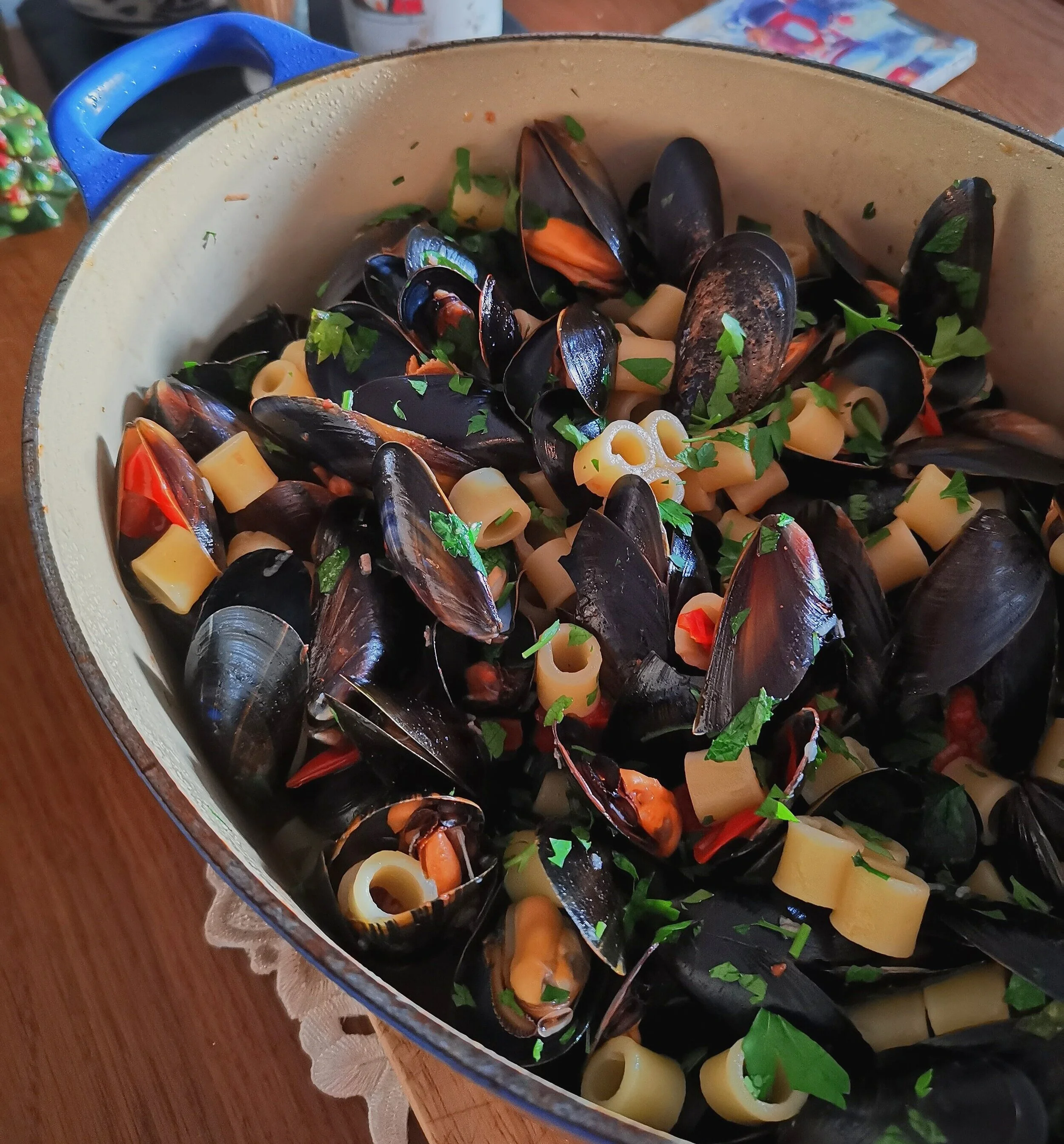 I now see clearly beyond my stubborn - “must include dairy” - way of thinking and took great joy in eating my way through a bowl of these mussels, which always look so appealing with their dark blue/blackish shells, their nacreous interior walls and amber-hued, plump tender meat. Always worthy of a picture.