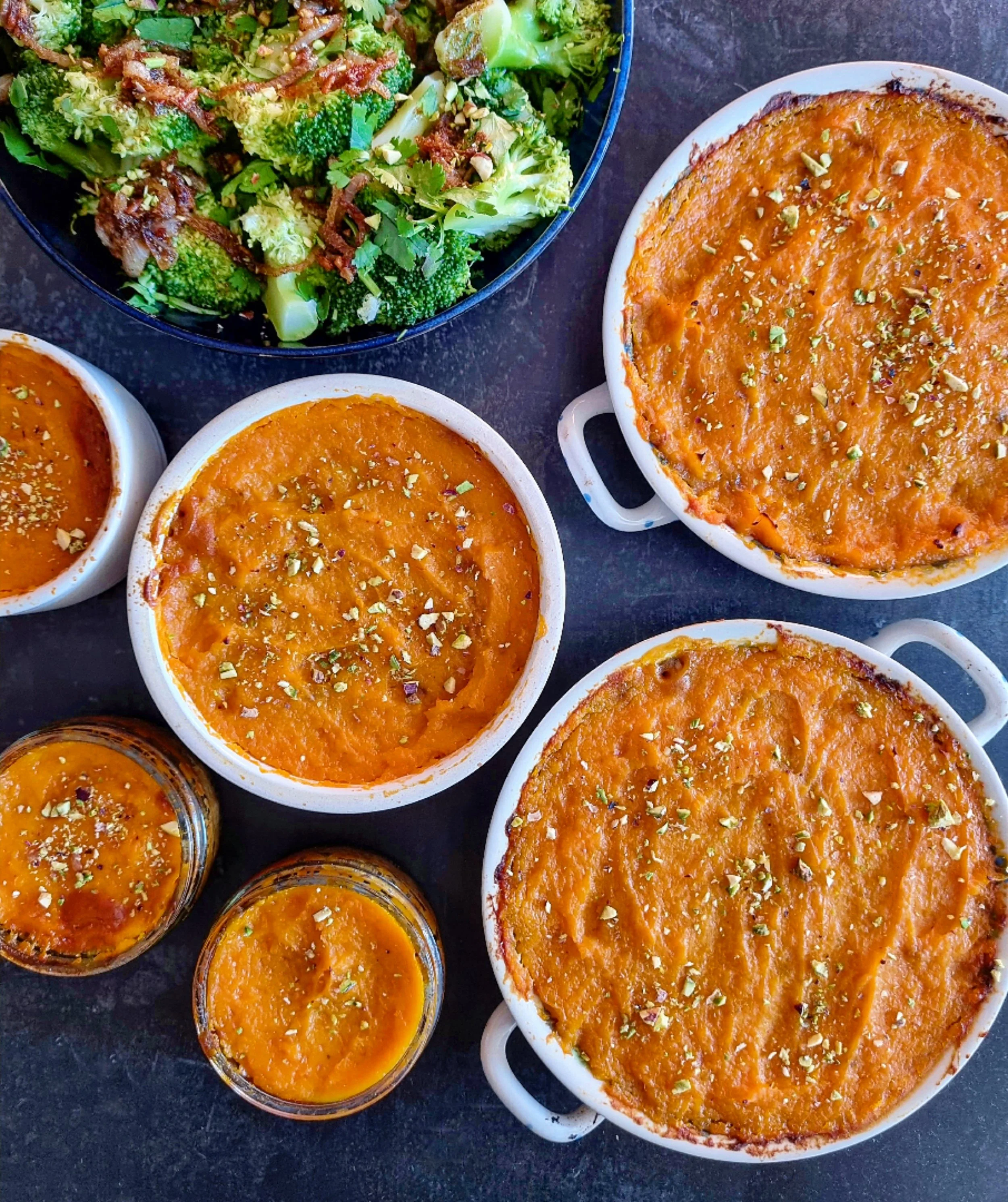 Served with steamed broccoli tumbled about with onions and garlic caramelised in coconut oil with ground cumin and garam masala, chopped pistachios (left from topping the pies) and fresh coriander. Pic of the on my Insta, should you be interested.