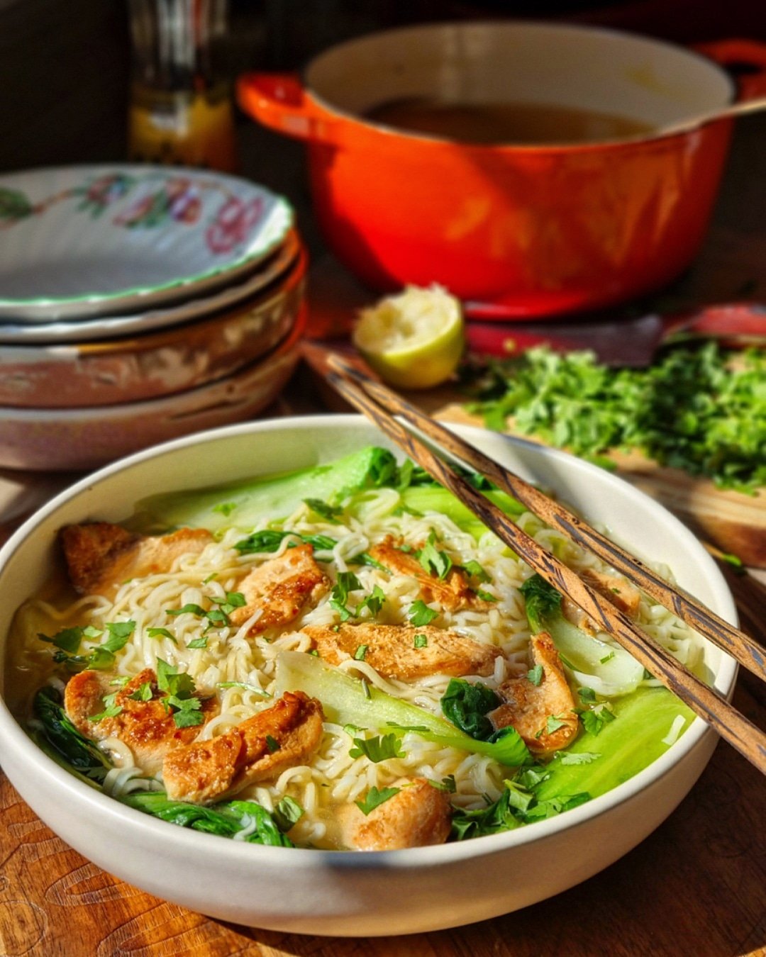 Day 244 is Nigella’s Sunday Night Chicken Noodle Soup. Enjoyed in a sunny kitchen with a cool Spring breeze passing over us and in and out of open windows.