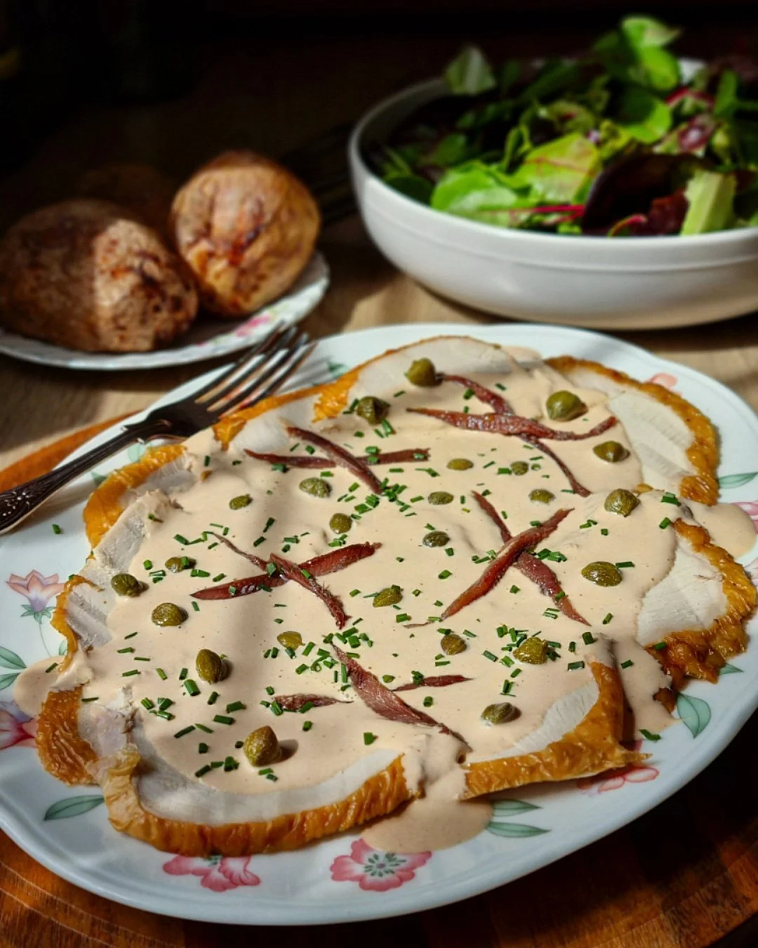 No, this isn’t about me cooking and eating in the nude (you’re disappointed, I know). It’s about turkey. And not a naked turkey, either. Quite the opposite, in fact: it’s about tender slices of turkey dressed in the silkiest of beigey/buff-coloured trench coats (a creamy, tangy tuna-mayo sauce) embellished with the salty powerhouse punch of anchovies and capers. Day 253 is Nigella’s Turkey Tonnato.