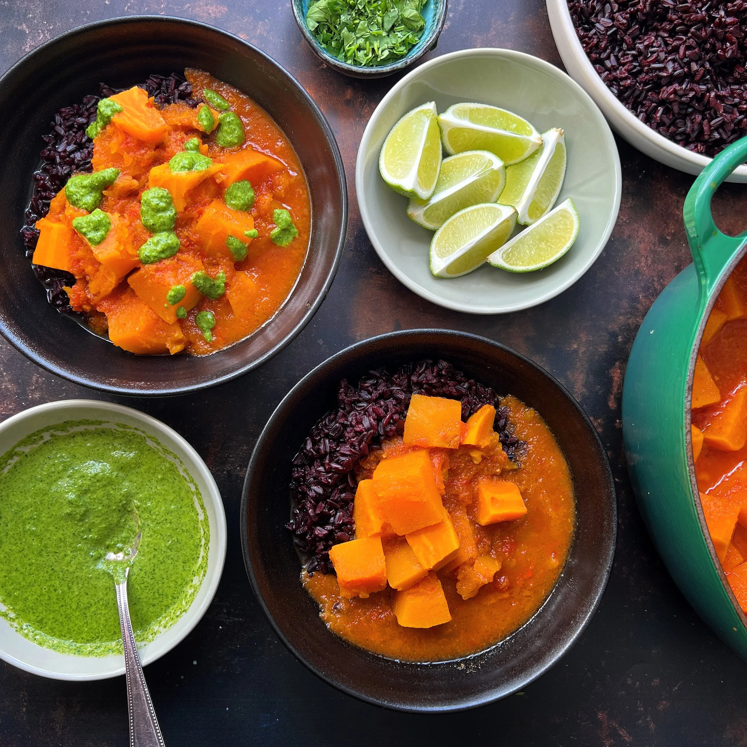 The recipe for Nigella’s Butternut and Sweet Potato Curry can be found on p64 of At My Table and on nigella.com (link below).