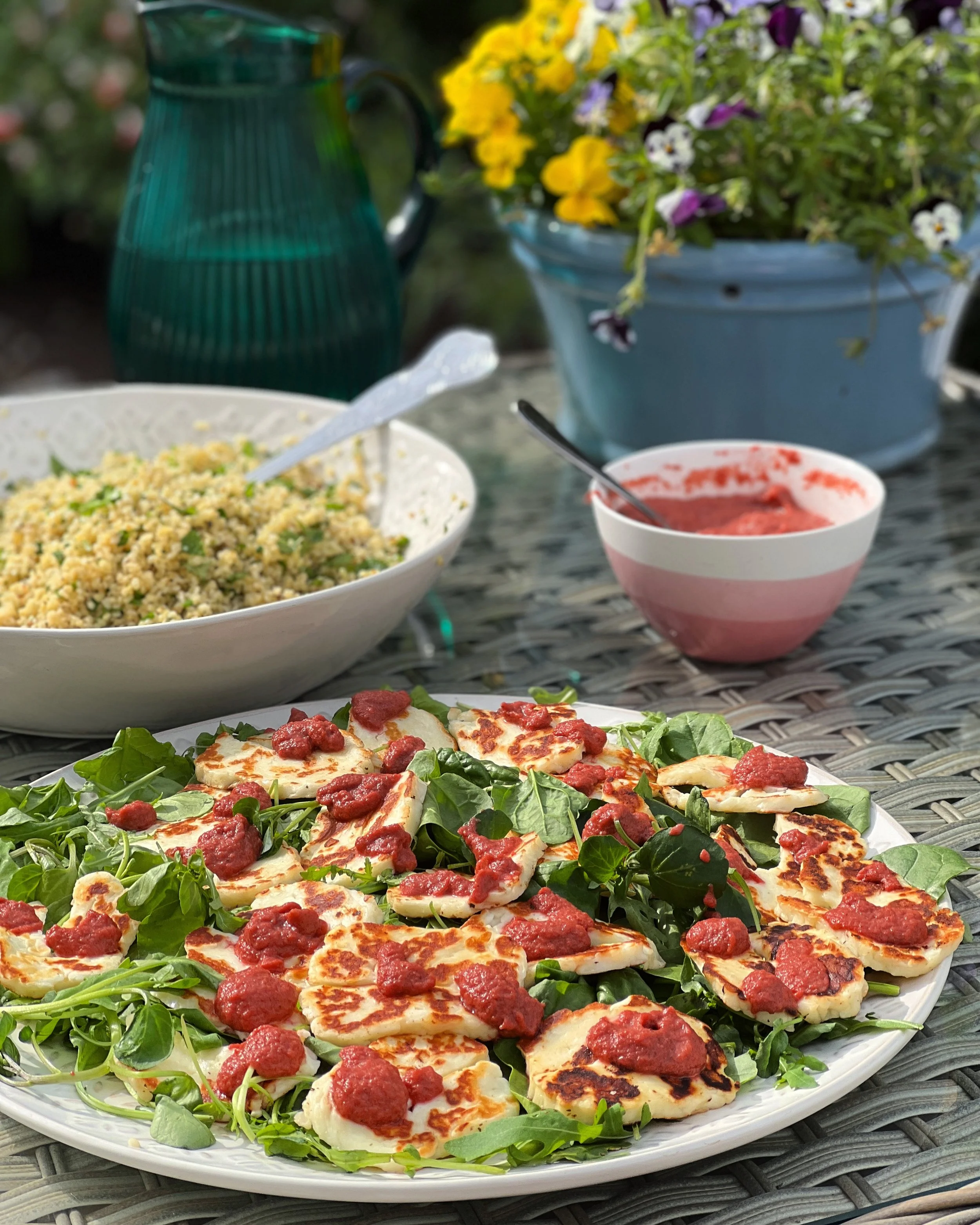 A plate of colourful, jolly deliciousness that instantly uplifts. Just to look at it makes you happy. Day 275 is Nigella’s Halloumi with Beetroot and Lime; herb-flecked bulgur wheat and extra sauce on the side.