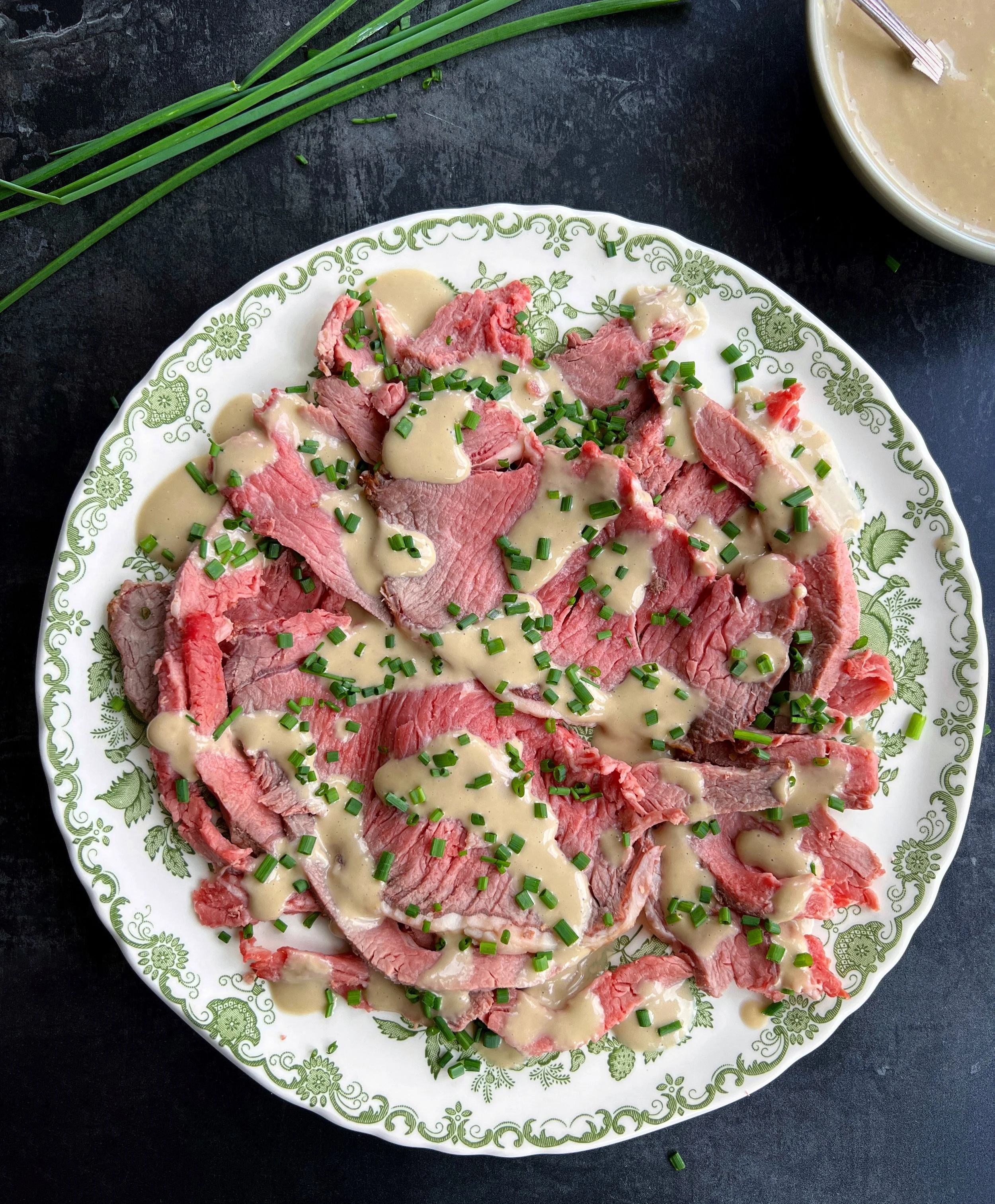 Mega treat for lunch earlier in the week: Nigella’s INCREDIBLE Anchovy Elixir, spooned with the biggest smile over a few cold, pink slices of Sunday’s roast beef. Allium shower of green to finish.