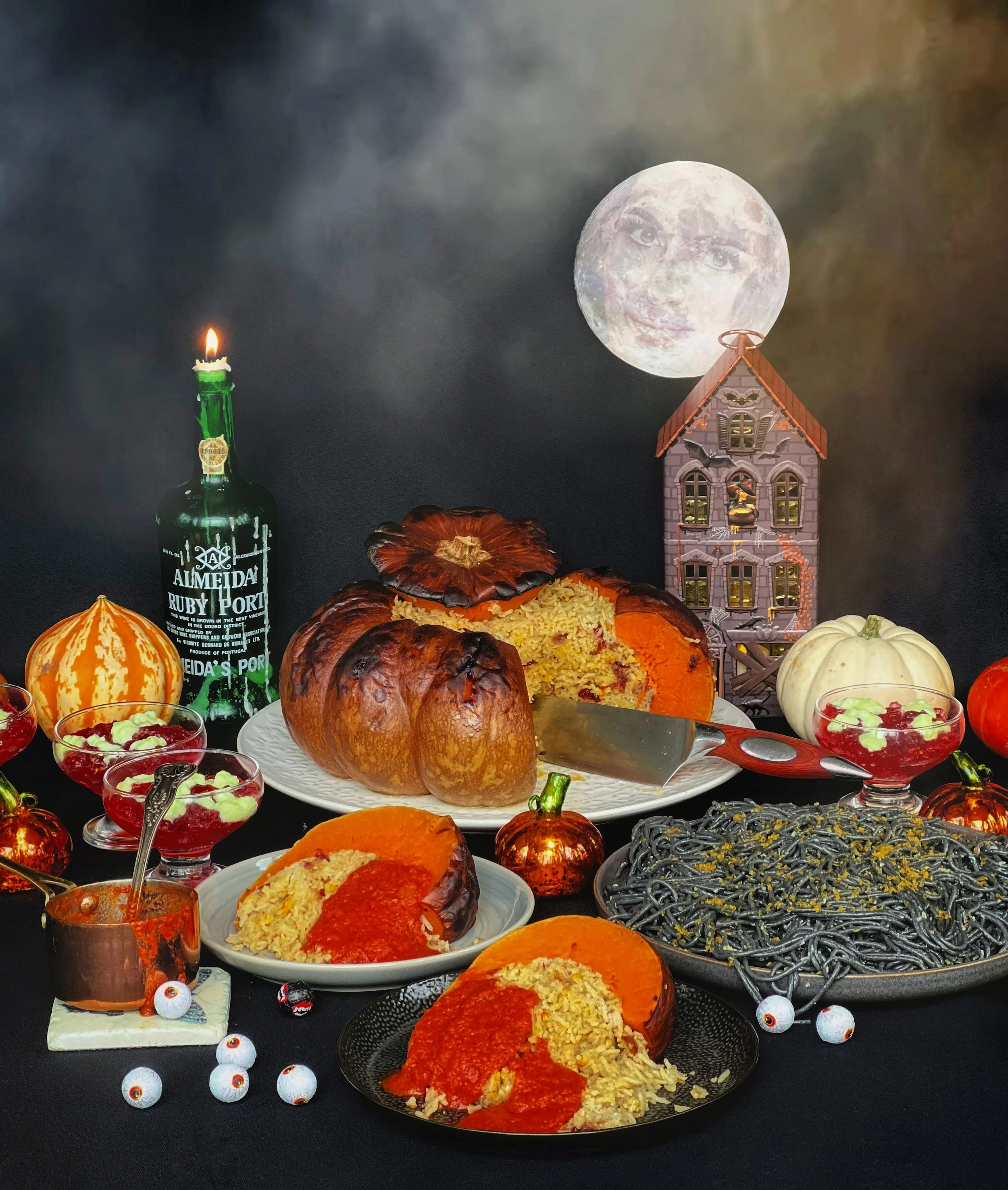 A delectable Nigella #Halloween Feast, Day 312, brought to you by the whole family: an enchanting Roast Stuffed Pumpkin with Gingery Tomato Sauce, Sea Witches’ Hair with Pumpkin Monster Dandruff (squid ink spaghetti with bottarga) and Blood Clots & Pus for deliciously gruesome afters.