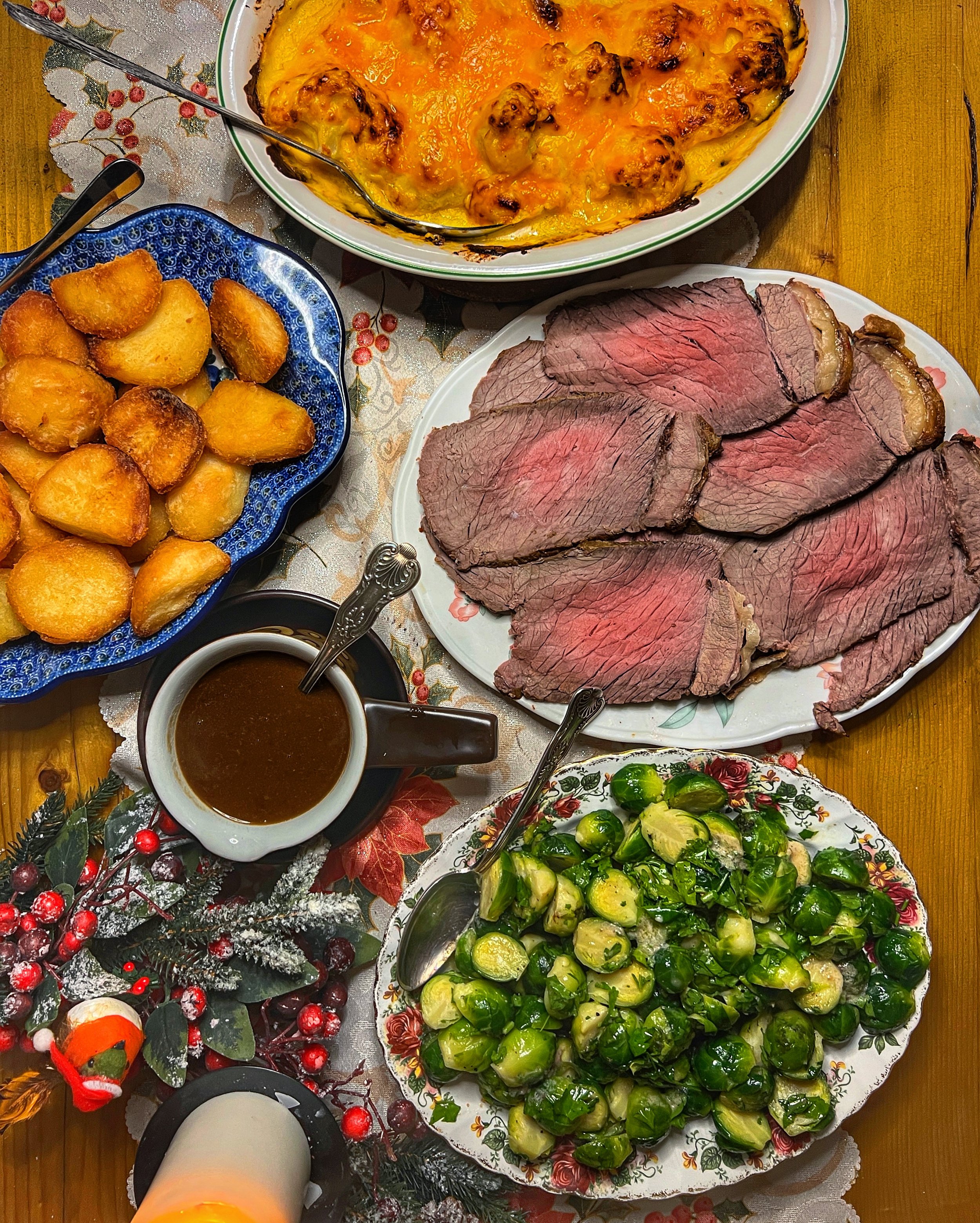 Everything else pictured: roast topside of beef; dripping-roasted potatoes; Nigella’s Red Leicester Cauliflower Cheese; and steamed sprouts with anchovy and garlic butter and fresh parsley (N’s Bagna Càuda Butter recipe from Summer).