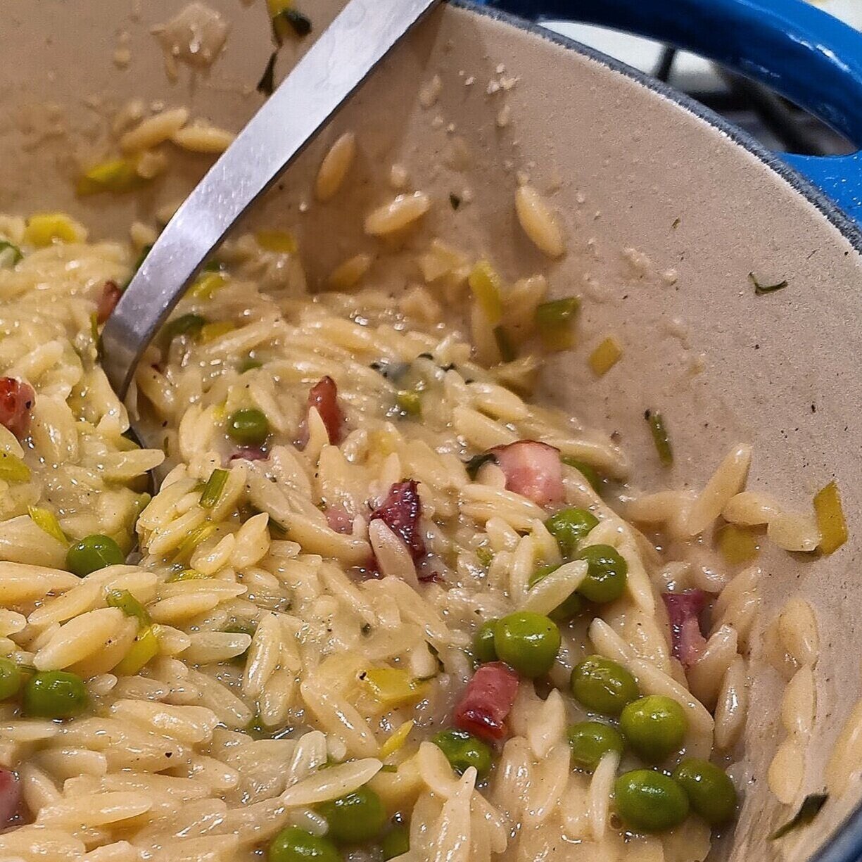 I didn’t actually intend on making one for the cookalong today, rather instead I had planned on a one-pot-improv-dinner as it was quite late in the evening already and I had been sat at the computer for what seemed like 12 hours (to be fair it wasn’t far off!). I proceeded - as planned - to get the ingredients together, collecting anything that crossed my mind: some orzo from the cupboard, a cup of frozen petit pois from the freezer, a packet of cubed pancetta (dangerously close to its best before date) from the fridge, a rather wilted leek, and some parmesan.