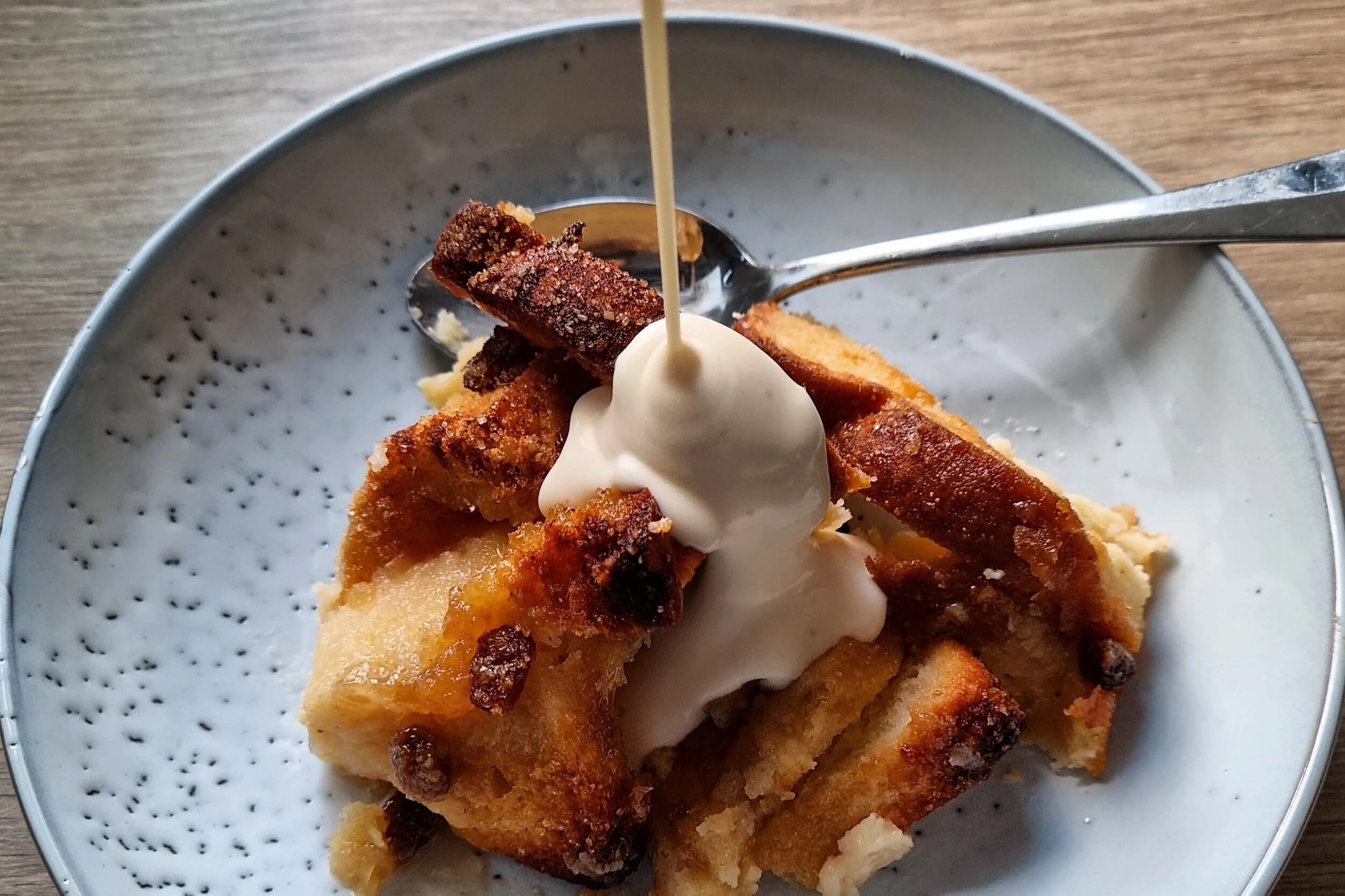 Following my seek for help on Twitter, which confirmed that I did in fact have the no-fan-function on my oven (maybe that’s standard, I don’t know), I was delighted that this pudding came out evenly bronzed and cooked throughout. No unwanted burns either; aside from the odd carbonised sultana, which is common in all bread and butter puddings I think.