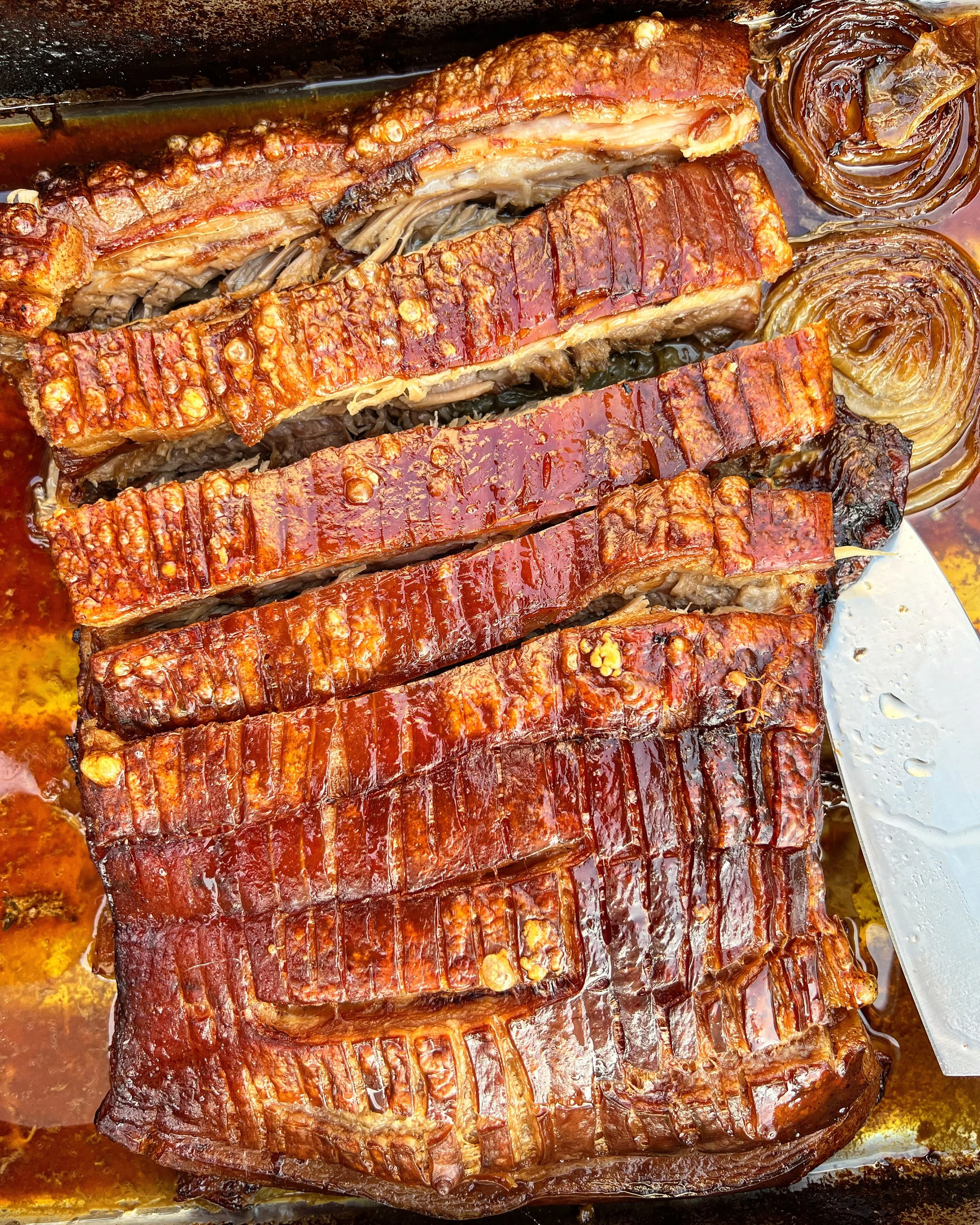 I’ve been a little off my game in recent weeks. And I confess that in my usual haste, coupled now with the additional distraction of children asking me a hundred questions a minute, I didn’t read the recipe properly and cooked the pork covered for the whole duration (instead of covered for the first stint and then uncovered for the second, longer one). It was nothing a little high-force, oven-with-the-fan-on blasting couldn’t fix and I managed to end up with near-perfect crackling; if I were famous for my patience, then I probably could have achieved a more even blistering and crunch all over. However, there were no complaints. Only harmonious groans of utter contentment between the synchronised crunching.